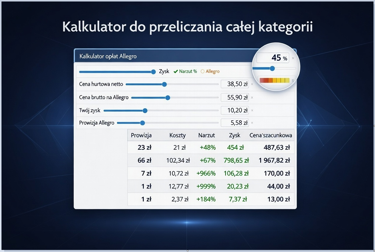 To narzędzie, które pozwala wyliczyć realne ceny ofert dla całej kategorii – z uwzględnieniem wszystkich kosztów, opłat i dostaw.